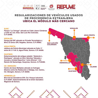 - En San Luis Río Colorado, Nogales, Agua Prieta, Guaymas y Cajeme. *Hermosillo, Sonora, a 12 de enero de 2024.-* A partir del próximo 22 de enero el Registro Público Vehicular (Repuve) de Sonora, instalará módulos fijos para apoyar a la ciudadanía interesada en realizar el trámite de regularización de autos usados de procedencia extranjera en San Luis Río Colorado, Nogales, Agua Prieta, Guaymas y Cajeme anunció, la Secretaría de Seguridad Pública (SSP). Con esta acción la SSP Sonora externó, contribuirá con el proceso que brinda legalidad y certeza de propiedad acercando este beneficio a los diferentes municipios. Recordó que los propietarios de las unidades a legalizar deben contar con el título original para los vehículos cuyo número de serie inicia con letra. En Hermosillo destacó, el módulo fijo está disponible y presta el servicio en forma permanente en el estacionamiento de la Unión Ganadera Regional de Sonora ubicado sobre Blvd de los Ganaderos. Recordó a las y los propietarios de vehículos a legalizar que, el portal oficial para agendar citas es http://regularizaauto.sspc.gob.mx. Y en caso de dudas sobre el proceso convocó, ingresar a la página de Repuve http://repuvesonora.gob.mx.